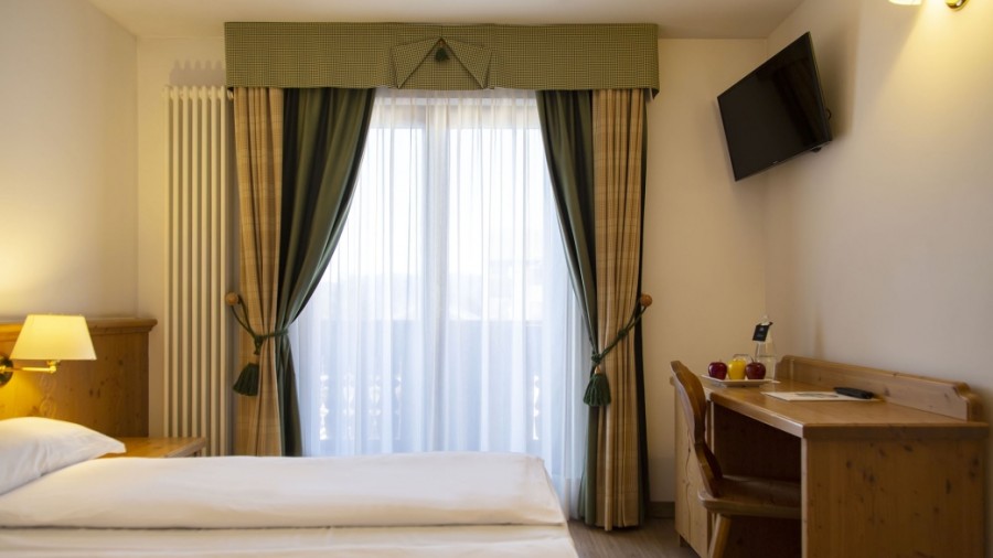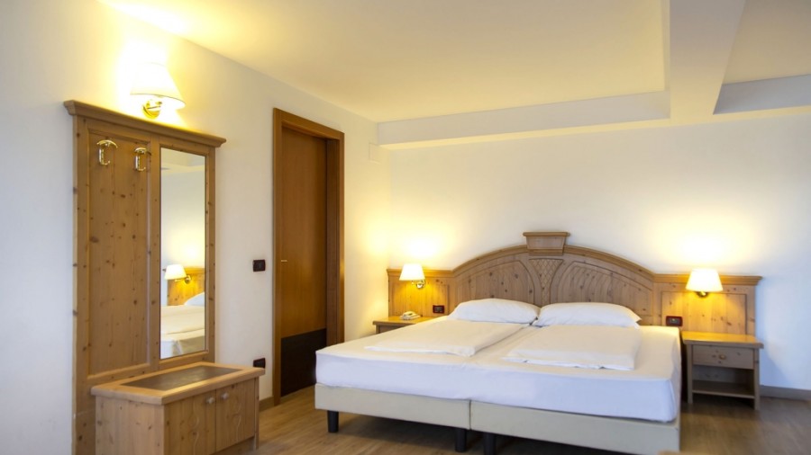 Familiar: Situadas en la zona de residencia directamente conectada al edificio principal, están decoradas en estilo montañés típico con suelos y revestimientos de madera. Compuestas por dos ambientes separados: una habitación con cama matrimonial y una zona de estar con sofá cama. Algunas tienen un característico altillo interno, especialmente adecuadas para familias. Disponen de balcón con vistas a los Alpes.