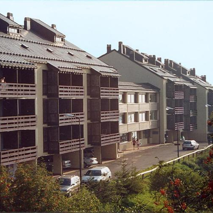 El complejo se distribuye en cuatro edificios residenciales más un quinto edificio central que concentra los servicios comunes, con áreas deportivas y espacios de ocio.